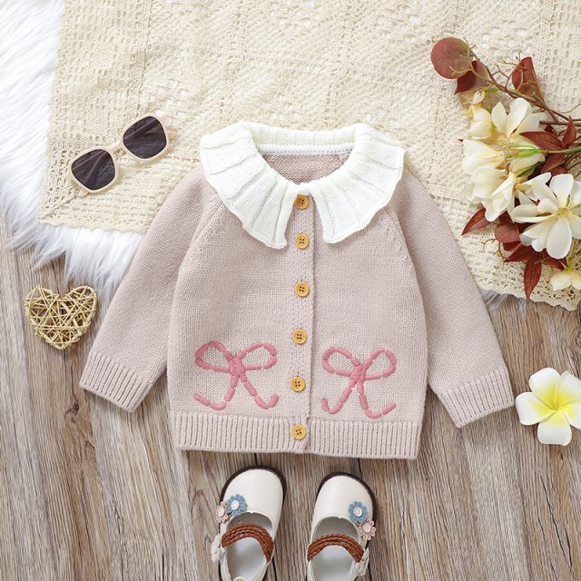 Keep your baby girl warm and stylish this autumn with our cozy knitted cardigan designed especially for infants and toddlers. Made from soft acrylic material, this sweater is gentle on delicate skin and perfect for cooler days in fall, spring, and winter. Featuring a charming cartoon pattern and cute bow accents, it adds a touch of sweetness to any outfit. The turn-down collar and single-breasted closure make it easy to dress your little one quickly without any fuss.